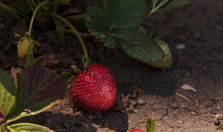 Natural light. vegetable garden, garden bed. Red strawberries grown at home without the use of chemical fertilizers