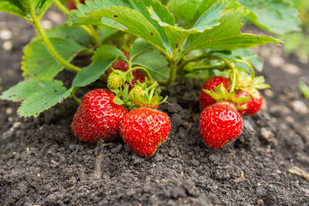 Ripe red strawberries in a garden bed in a small home garden.