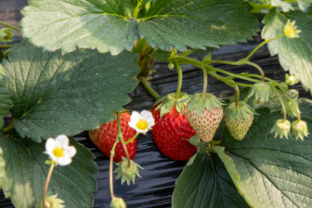 Strawberry plant with ripening berries growing in garden