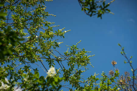 Summer spring background, Bird Cherry Tree in Blossom, white flowers of bird cherry tree in spring.