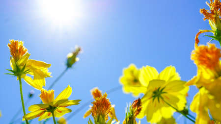 White yellow heads of field daisies against the blue sky in summer. The blooming of spring flowers in the meadow. Natural landscape low angle view. soft focus. Rural nature, plants and flowers.