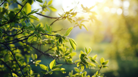 Fresh green leaves glisten in sunlight filtering through a serene forest canopy