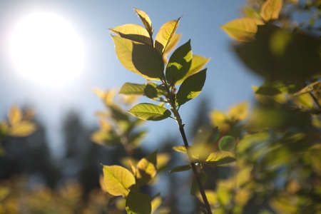 Spring leaves against the background of the setting sun. Nature and the forest around us. Front view.