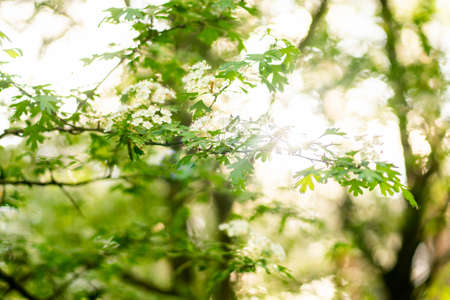 Branches of a blooming apple tree in the rays of the setting sun on a spring evening. The season of fruit trees and flowering bushes