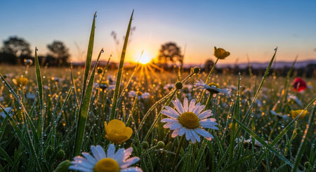 A macro shot captures the delicate beauty of a meadow at sunrise. Dewdrops glisten on blades of grass and wild flowers, including white daisies with yellow centers and small yellow buttercups. The rising sun casts warm, golden rays through the scene, creating a magical, serene atmosphere with soft focus and a gentle bokeh effect.