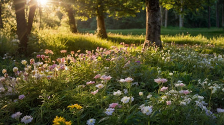 Enchanting spring meadow with soft flowers and warm light creating a dreamy landscape horizon