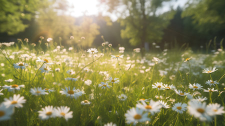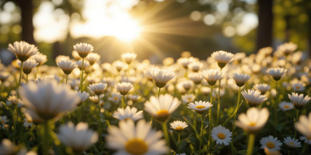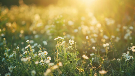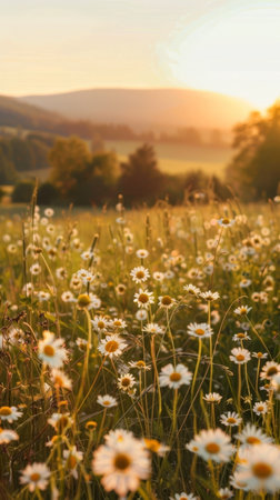 Idyllic meadow filled with vibrant wild daisies glowing under the warm hues of a beautiful sunset.