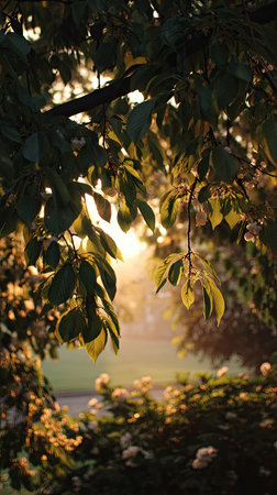 The Cherry tree at dawn, soft golden sunlight kissing leaves, clean air, natural color tone.