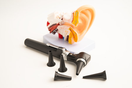 Otoscope with ear model for otolaryngologist or ENT physician doctor examining senior patient ear, hearing loss problem.