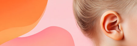 Healthy ear highlighted against a vibrant, abstract background of flowing pink and orange shapes, emphasizing the significance of hearing and auditory health