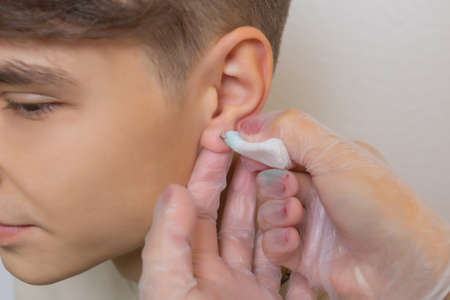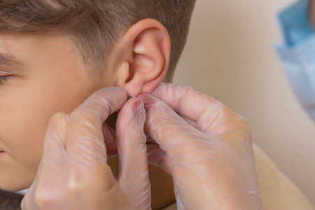Preparation before otoplasty ear surgery. Procedure for changing the shape, position or size of the ears. Surgeon doctor examines ear of male patient before otoplasty surgery
