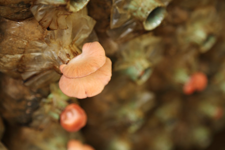 Pink oyster mushroom (Pleurotus djamor) on spawn bags growing in a farm