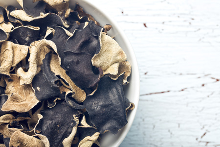 Dried black mushroom on white wooden kitchen table. Wood ear mushroom pile top view photo. Dry mushroom for soup or garnish ingredient. Natural healthy food from chinese market. Asian cuisine dish