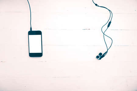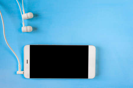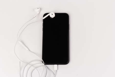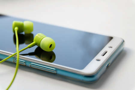 Mobile phone on a white background. White headphones on the phone. Close-up.