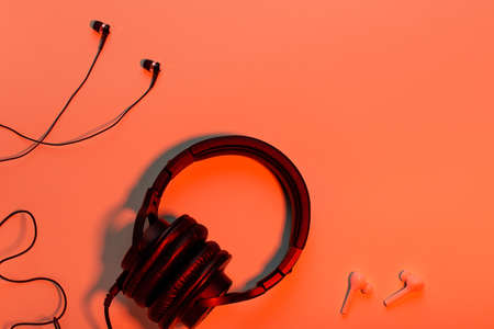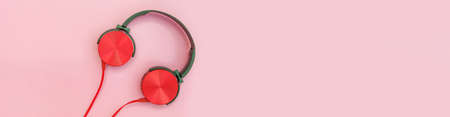 Red headphones on pink background. Minimalist simple photo of earphones with copy space, banner. Red dj headphones with cable isolated on colorful backdrop, flat lay top view. Music concept