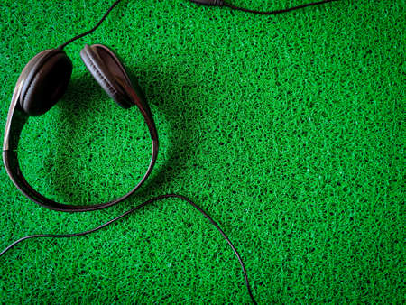 Wireless Over-Ear full size Headphones, Black and red leather isolated on green background with clipping path.set of wireless and corded headphones, earphones. music accessories.