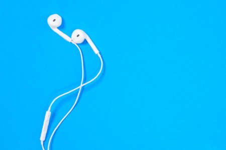 Wireless in ear headphones and cable earphones on blue background close up. Minimal music concept. White earphones flat lay
