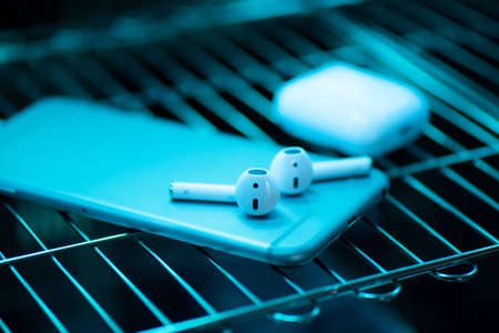 UV light sterilization of smartphone and earbuds. COVID-19 prevention concept.