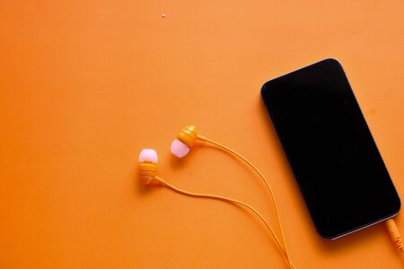 Smart phone with headphones on a yellow and blue background. Top view. Listening music