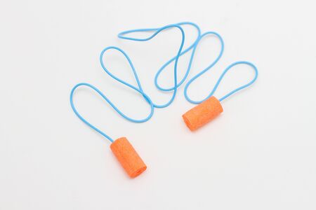 Orange earplug on thread. Earplug to reduce noise on a white background .