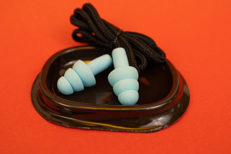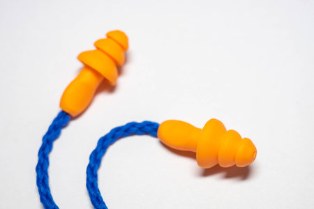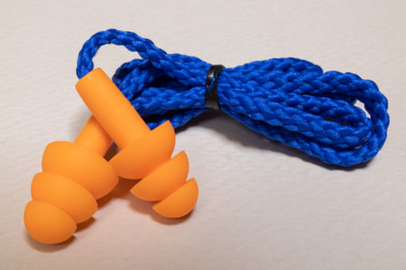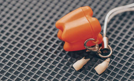 Orange reusable ear plugs in construction site, personal safety equipment concept. Outdoor shooting and shallow depth of field.