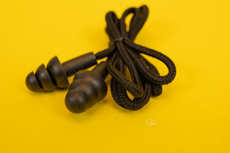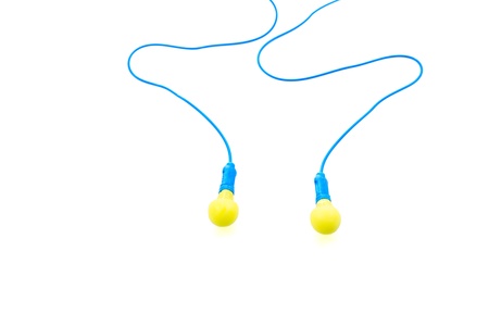 Macro shots of multiple earplugs in yellow and white for noise protection.