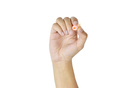 Ear plugs hearing protection in men's hand on white background,safety concept