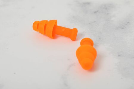 Ear plugs isolated on white background. Orange ear plugs isolated. Selective focus.