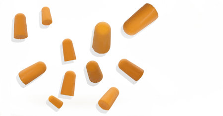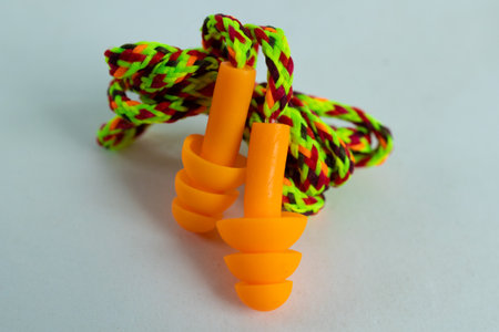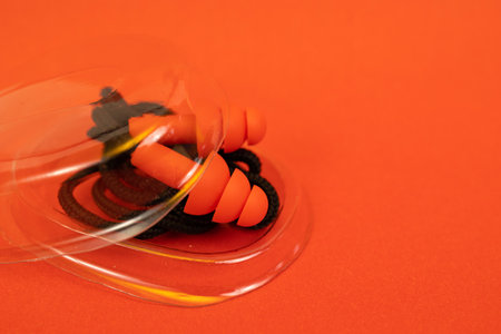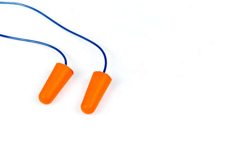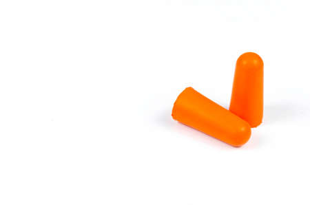 Orange rubber ear plugs on a white background with copy space