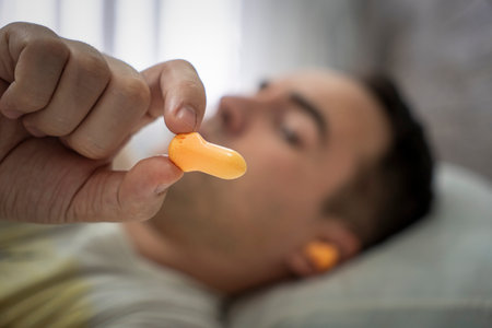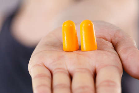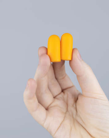 The man puts on earplugs. Close-up of an orange noise barrier. deep sleep. The ENT doctor advises orange earmuffs to reduce ambient noise. Increased sensitivity to sounds.