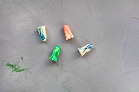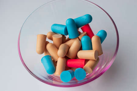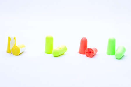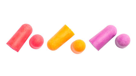 Pairs of earplugs against noise in different colors isolated on white background. Protective equipment - earplugs against noise. Hearing protection. Necessity in a noisy environment.