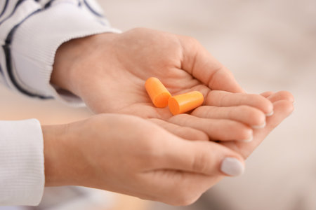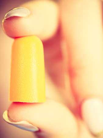 Woman holding protective ear plugs. Getting rid on noise in loud place, hearing protection concept.