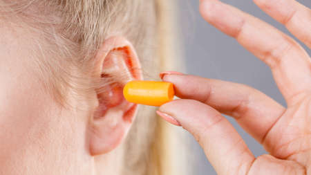 Woman putting ear plugs into her ears getting rid on noise in loud place.