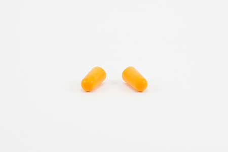 Orange and yellow foam ear plugs isolated on a white background. Studio shot.