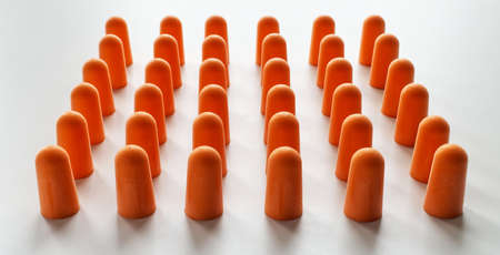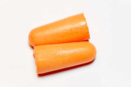 Ear plugs isolated on white background. Orange ear plugs isolated. Selective focus.