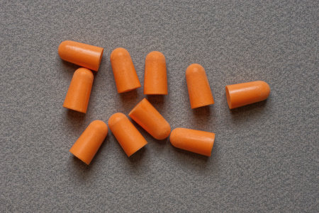 heap of red plastic earplugs on a gray table