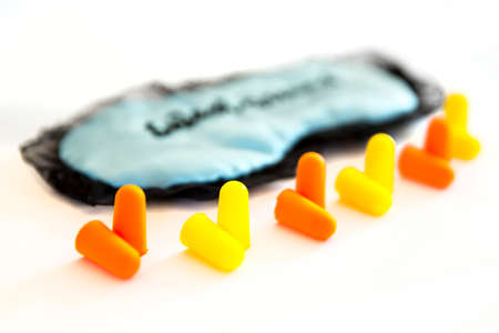 Sleeping mask with orange and yellow ear plugs isolated on a white background. Sweet dreams. Studio shot.