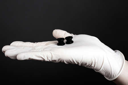 ear jewelry, black tunnels for the ears in the palm of your hand on a dark background close-up.