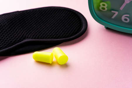 Earplugs, blindfold and sleeping pills on bed