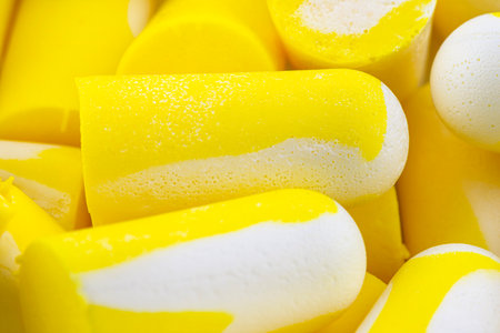 Macro shots of multiple earplugs in yellow and white for noise protection.