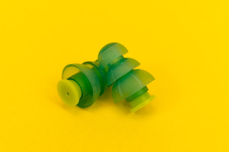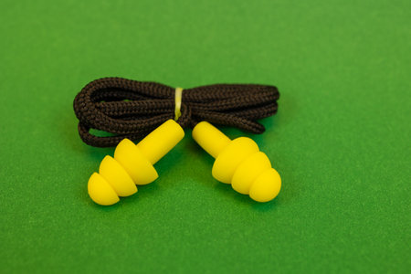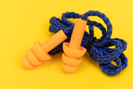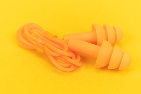 Silicone ear plugs for human ears on yellow background