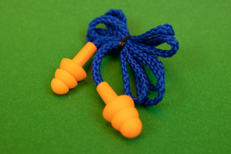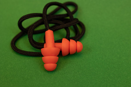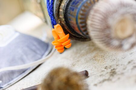 Orange reusable ear plugs in construction site, personal safety equipment concept. Outdoor shooting and shallow depth of field.