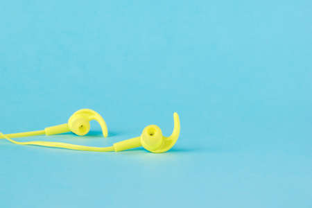 Yellow wired headphones on a bright blue background. Headphones for mobile devices.
