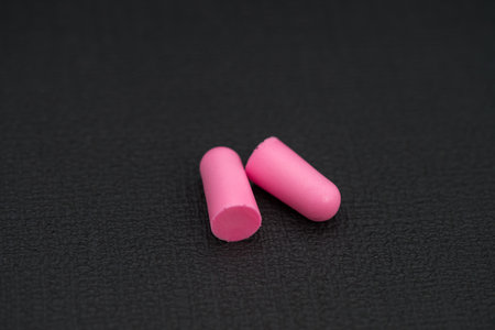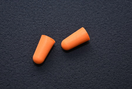 two of red plastic earplugs on a gray table