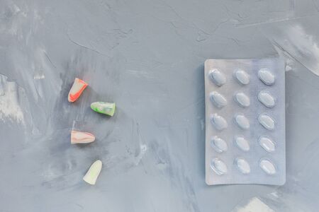 Two pairs of earplugs and blister pack of pills on gray background. Good sleep and noise protection concept. Copy space.