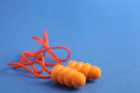 Pair of orange ear plugs with cord on blue background, closeup. Space for text