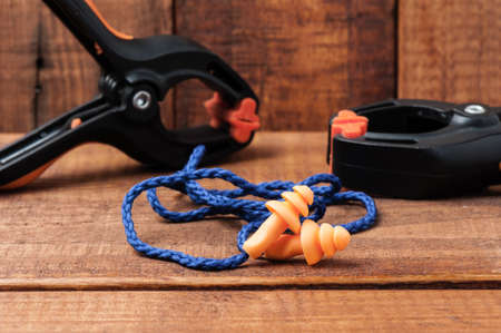 Orange reusable ear plugs over wood background, personal safety equipment