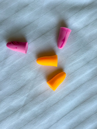 Foam earplugs in pink and orange color lying on a white bed sheet. Health, sleep, protection, lifestyle accessory and travel accommodation detail.