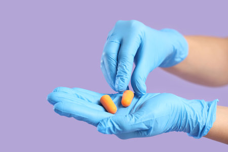 Female doctor with ear plugs on lilac background