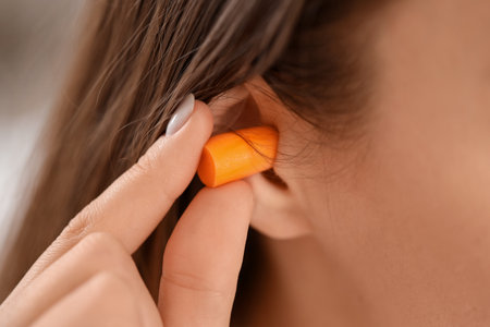 A close-up shot of a person inserting a soft orange foam earplug into their ear canal. This image illustrates concepts of hearing protection, noise reduction, workplace safety, or preparing for sleep.